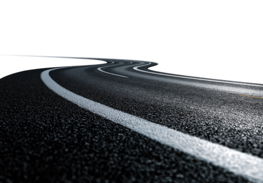A dark, curved asphalt road with white lane markings.  The road appears to be winding into a dark tunnel or distant light source.  Distant, blurry streaks of light suggest motion or headlights