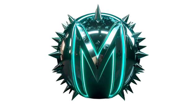 Glossy orb with "M" design, surrounded by spikes, glowing teal on black
