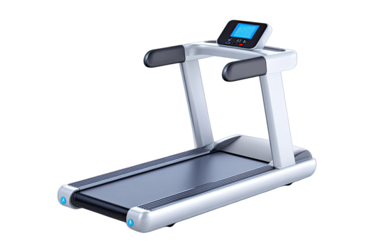 3D rendering of a modern treadmill.  A sleek, silver and gray treadmill