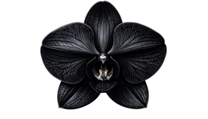 A digitally rendered, strikingly dark orchid with intricate petal textures against black backdrop