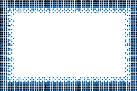 A digitally abstract rectangular frame with a pixelated blue and white grid pattern surrounds a large empty space.