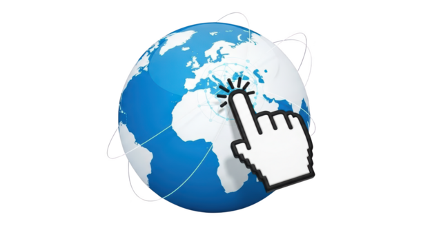 A large hand cursor clicks on a blue and white globe with orbiting lines around it.