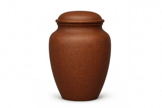 Closed brown ceramic funeral urn resting in solitude, isolated on a transparent background, conveying a sense of dignity and remembrance