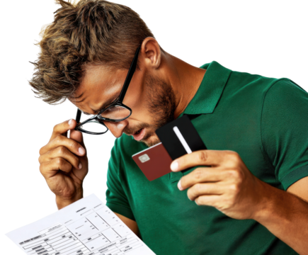 A Young Man with Glasses Examining Financial Documents While Holding Credit Cards, Depicting Modern Banking Challenges and Consumer Awareness isolated on transparent background