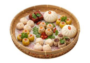 Assorted dim sum on a bamboo tray isolated on transparent background
