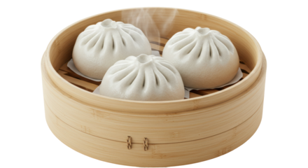 Steamed Chinese Baozi Bun in Bamboo Dim Sum Basket isolated on a solid white background Png form