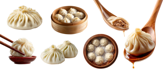 Set of Xiao Long Bao baozi, tangbao, soup dumplings, Chinese steamed bun, broth and meat filling, spoon chopstick, steam boil isolated on transparent cutout PNG. Many different Mockup template