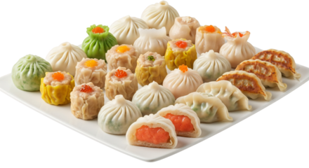 Assortment of delicious dim sum and dumplings, including siu mai, har gow, and bao, isolated on transparent background