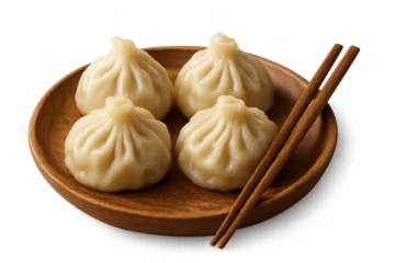 Steaming asian dumplings on a wooden plate with chopsticks, a traditional dim sum appetizer on transparent background