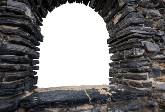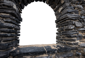 Closeup of a defocussed window with stone wall and arch, isolated on white or transparent background for inserting your own landscape or panorama. Porto Venere, La Spezia, Liguria, Italy, Europe. Png.