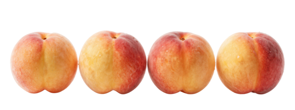 Four ripe peaches, side by side. Each peach is round with a mix of yellow and red skin, slightly textured, and has a small dimple at the top.