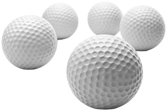 Several textured, spherical white golf balls constructed from durable Surlyn resin with a dimpled surface pattern, are dynamically arranged in a close-up, isolated on transparent background.