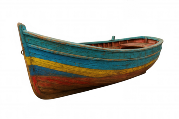 Colorful weathered wooden rowboat floating, vintage nautical watercraft resting against transparent backdrop