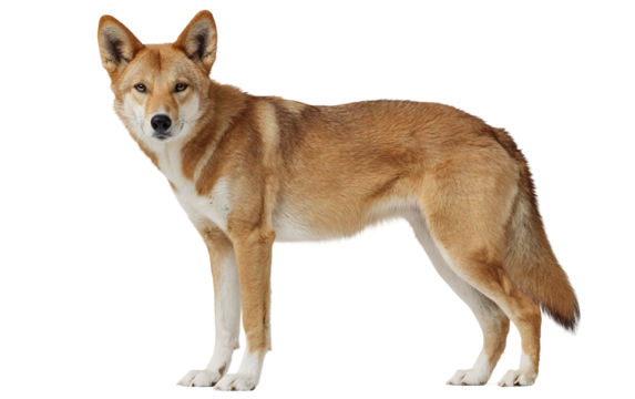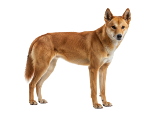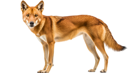 A majestic dingo standing confidently against a white background. its sleek fur and alert expression. perfect for nature-themed projects or animal behavior studies
