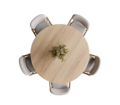 Overhead View of a Round Dining Table with Eight Chairs and Plant Centerpiece