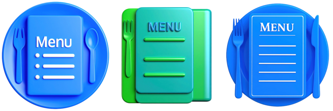 3D Plastic Style Menu Icon with Blue And Green Tones Featuring Utensils and Food List Design Isolated on Transparent Background