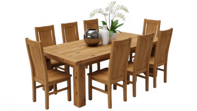 Dining Set in Sunlight: A sophisticated dining set, meticulously crafted from light wood, stands poised, ready to enhance any home. The sunlit ambiance amplifies its warmth and elegance.