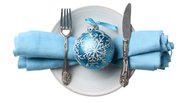 blue napkin and ornament table setting for Christmas dinner, isolated on white background