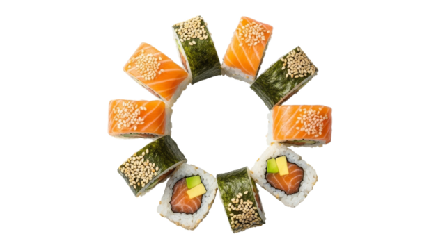 Vibrant circle of salmon sushi rolls adorned with toasted sesame seeds against a stark white backdrop, promoting culinary elegance and freshness,