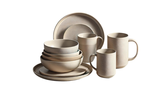 A realistic digital illustration of a set of modern dinnerware including plates, bowls, and a mug, on a transparent background