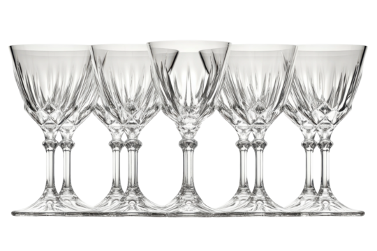 Six elegant crystal wine glasses arranged together perfect for a formal dinner party or special occasion Clear sparkling glassware on transparent background