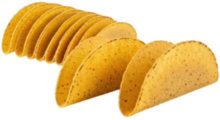 Isolated Taco shells in a row, stacked and leaning together, ready to fill with ingredients