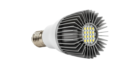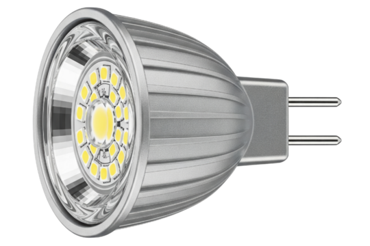 Silver LED spotlight bulb with yellow diodes for energy saving on a transparent background