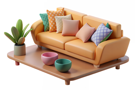 Cute 3d isometric illustration of a miniature landscape with green mountains, small pine tree, fluffy cloud, and bright sun isolated on transparent background