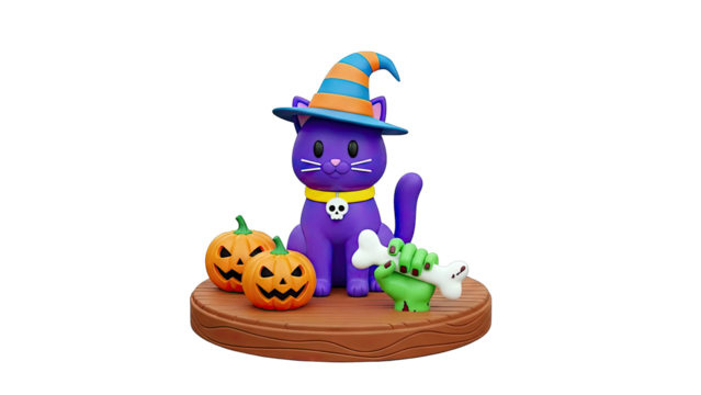 3D Halloween Diorama: Witch Cat, Pumpkins, and Zombie Hand