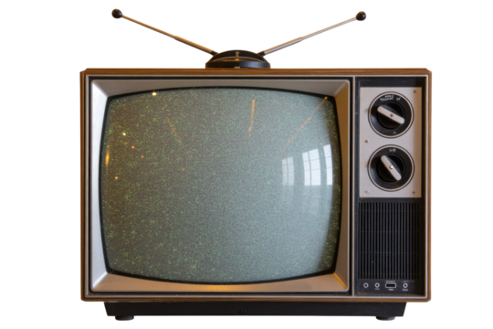 Vintage television with static screen and rabbit ear antennas, nostalgic retro image. background removed
