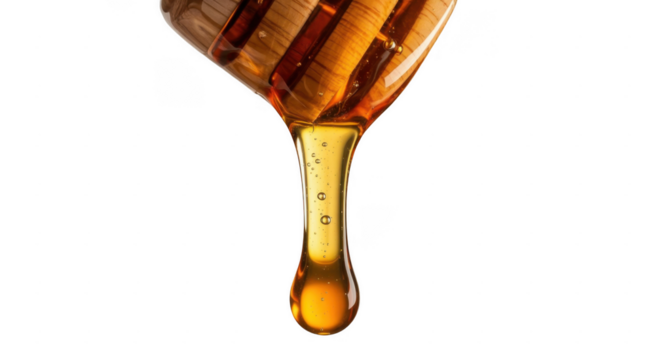 Honey dripping from a wooden honey dipper against a   isolated on transparent background