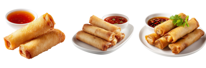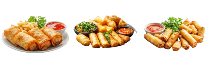 Set of Close-up shot of crispy egg rolls served on a modern white plate with dipping sauces on transparent png background