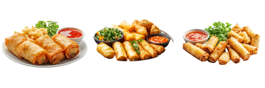 Assortment of spring rolls egg rolls french fries and dipping sauces isolated on transparent Background