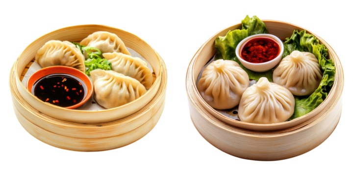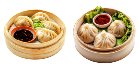 Delicious steamed dumplings served with dipping sauces and fresh greens.