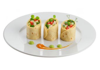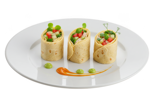 Three delicious chicken wraps with fresh vegetables and dipping sauces on a plate isolated on transparent background