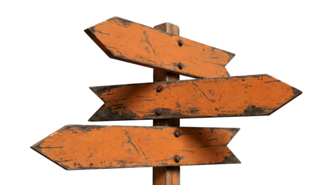 Arrow Sign PNG - 5Rustic Direction Signpost Concept: Orange weathered wooden arrow signs pointing in different directions, symbolizing choices, guidance, navigation, and decision making.
