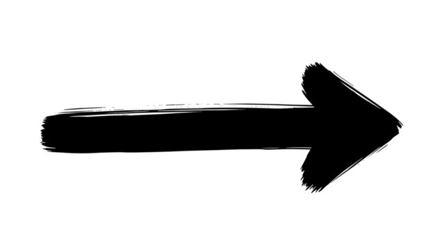 Black grunge brush stroke arrow graphic pointing right indicating direction and movement. isolated PNG with Transparent Background