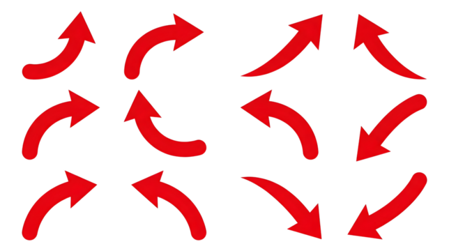 Directional Arrow Set Concept: Collection of red curved arrows pointing in multiple directions, symbolizing movement, navigation, choices, flow, and dynamic direction changes.