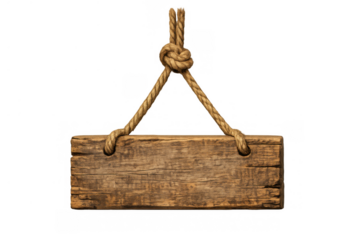 Blank rustic wooden sign hanging by rope, offering copy space on weathered timber for messages and directions