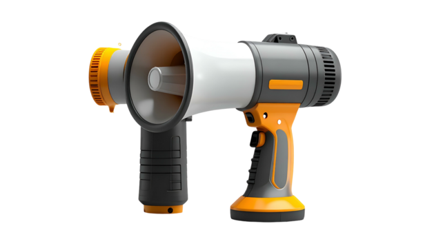 Isolated, gleaming golden megaphone against a stark black backdrop. Close up, detailed view