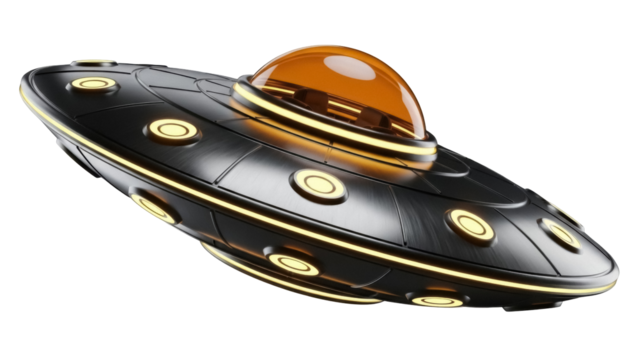 Black UFO flying saucer PNG isolated on transparent background, alien spaceship with orange dome for science fiction and space exploration