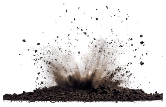 A dramatic explosion of dirt and debris captured in mid-air against a white background.