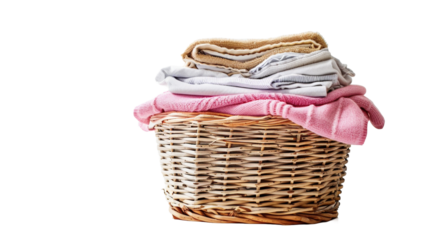 Isolated PNG Colorful Clothes in Woven Basket for Laundry with Fabric