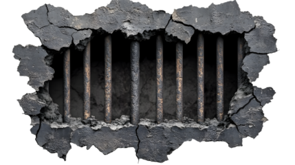 A broken wall with a hole in it and a metal grate in the middle