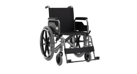 Black leather wheelchair with metal frame, resting on transparent surface, displaying medical mobility aid