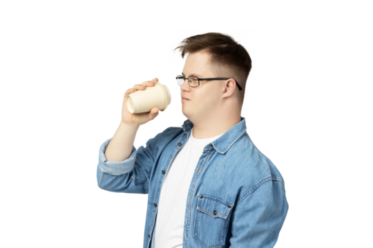 PNG,smiling young man with down syndrome in a white t-shirt poses for the camera,isolated on white background