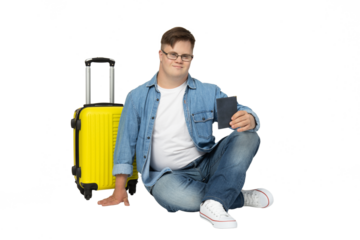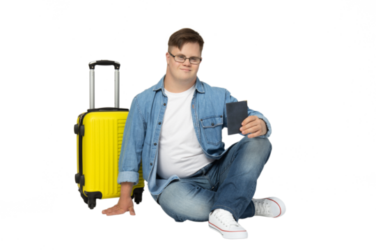 PNG,smiling young man with down syndrome in glasses with suitcase,isolated on white background