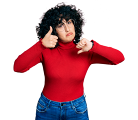 Young middle east girl wearing casual clothes and glasses doing thumbs up and down, disagreement and agreement expression. crazy conflict