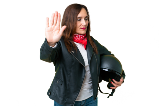Middle age caucasian woman with a motorcycle helmet over isolated chroma key background making stop gesture and disappointed