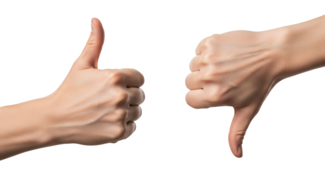Photorealistic fair-skinned adult hands, well-manicured, isolated on a transparent studio background. Left hand thumbs-up, right thumbs-down. Concept of approval and disapproval